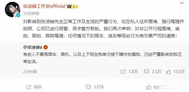 张凌赫工作室也迅速转发了该博文,并表示:“对影响到张凌赫先生正常工作及生活的严重行为,如在私人住所围堵、强行尾随并拍照,公司已进行报警,寻求警方帮助。我们再次声明:对非公开行程围堵、偷拍、跟拍,跟踪尾随;任何情况下的跟车、追车等恶劣行为表示最严厉的谴责!”这不仅是对张凌赫的保护,更是对所有艺人的一种警示。