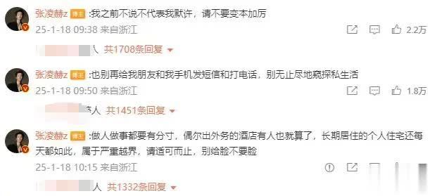 在评论区张凌赫继续补充道:“我之前不说不代表我默许,请不要变本加厉。”这句话,犹如一记响亮的耳光,打在那些自以为是的私生饭脸上。他们以为自己的行为是爱,却不知这所谓的“爱”,早已变成了束缚明星的枷锁。张凌赫还提到,“也别再给我朋友和我手机发短信和打电话,别无止尽地窥探私生活。”这种无孔不入的骚扰,不仅侵犯了明星的隐私,更让他们的社交圈也陷入了混乱。