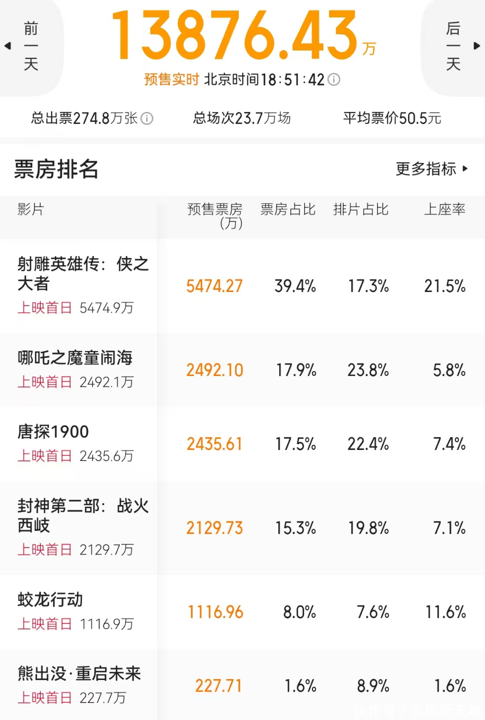 其中《射雕英雄传:侠之大者》完全断层领先,票房占比高达39.5%,预售票房已经超过5300万,按照这样的趋势,上映首日票房过亿没什么悬念。